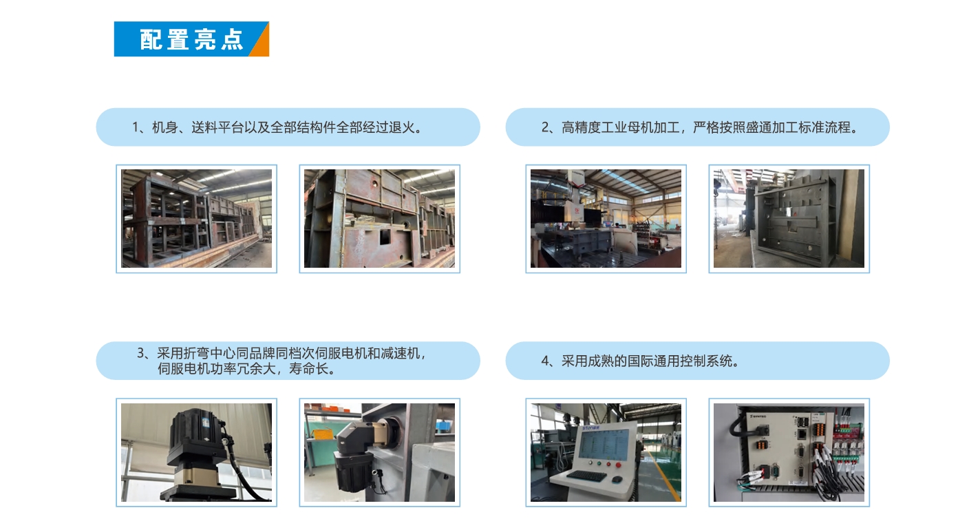柔性折边机的床身和结构件全部退火处理,大件退火过程可记录。系统、伺服电机、减速机等电器件采用盛通折弯中心同品牌同系列产品。专业工艺团队,根据您的工件给出客观合理的设备建议。